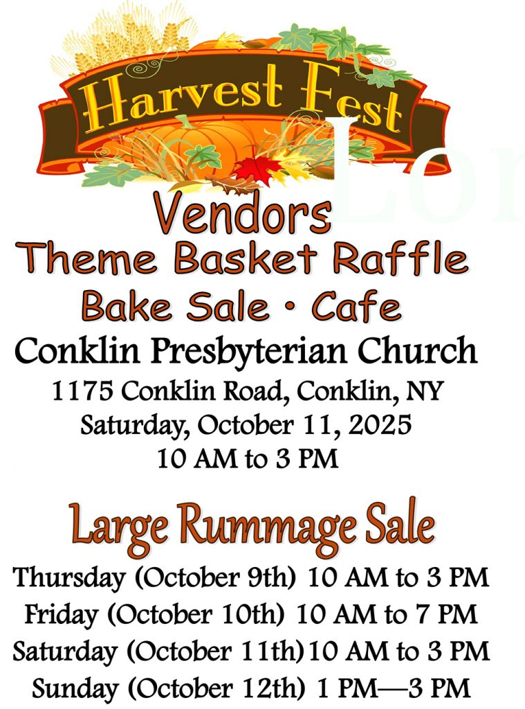 Home All CPC pics by MJS Upcoming events: Harvest Festival & Rummage Sale 2026 October 9th-12th Worship: Sundays, 11 AM @ 1175 Conklin Road, Conklin, NY